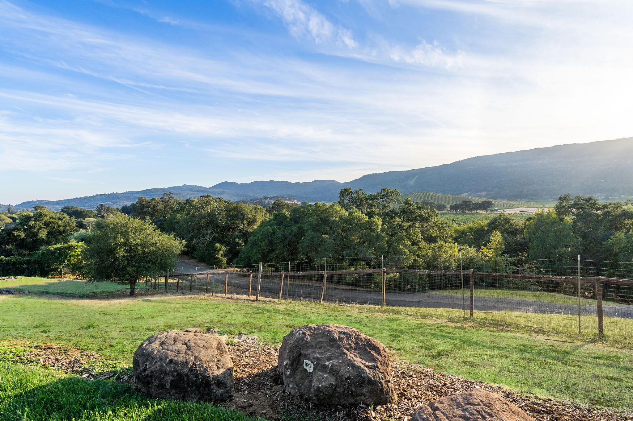 A hand-hewn wooden door opens to the chateau-style wine cellar on the main level of the tower; custom racking accommodates approximately 1,500 bottles and could be expanded into the hillside; an all-stone outside staircase leads up to the tasting room with arched openings on three sides looking out to the views